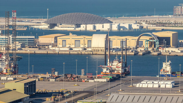 Aerial view of cargo ship, cargo container in warehouse harbor in the Morskie Vorota district in St. Petersburg