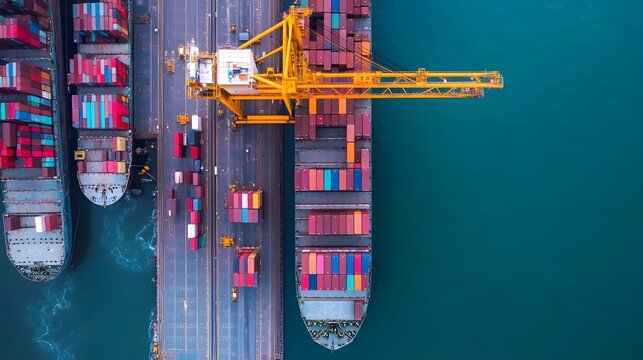 Logistics and transportation of container cargo ship working crane bridge in shipyard