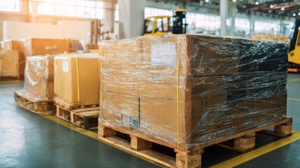 Warehouse with Wrapped Cargo on Wooden Pallets Ready for Distribution in a Spacious Modern Facility
