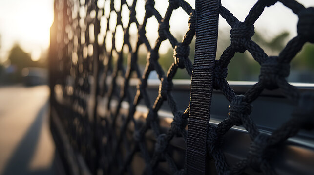 Focus on a durable black cargo net, its intricate knot patterns contrasting with the soft, golden sunlight, promising security and reliability for your cargo needs.