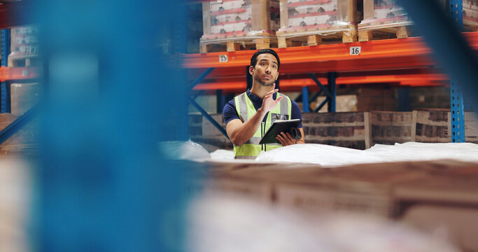 Man, tablet and inventory or warehouse inspection of cargo for ecommerce shipping, factory or production. Distributor, online and logistics service in storehouse for package, courier or planning