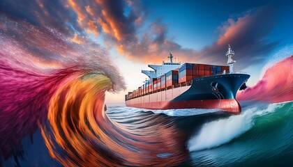 majestic cargo ship navigating through colorful abstract waves in an artistic ocean scene with vibrant splashes of color and dramatic skies