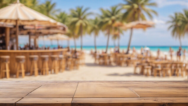 An empty wooden plank table on a blurred background of a sunny beach with sea palm trees and vacationing people near a cafe and bar