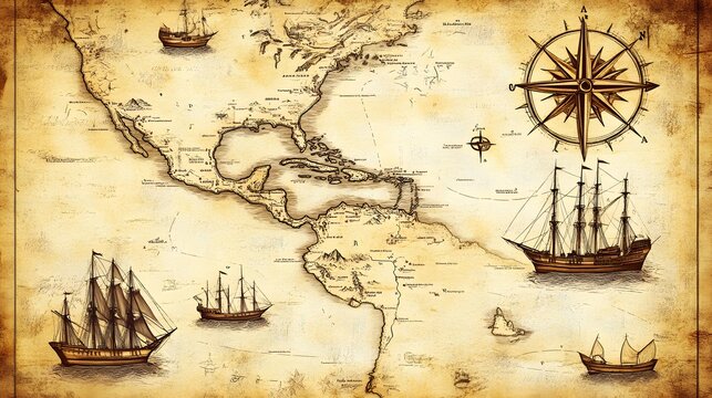 Retro style antique golden compass (sundial) and old nautical chart close-up. Vintage still life. Sailing accessories. Wanderlust, travel and navigation theme. Graphic resources, copy space