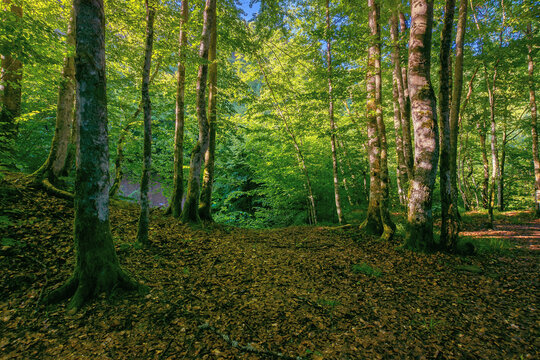 Sunlight filtering through trees in verdant forest