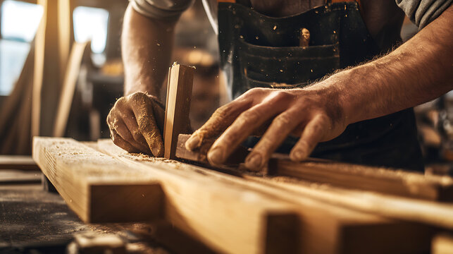 Hands of a craftsman carpenter working with a wooden board in his workshop, natural lighting.