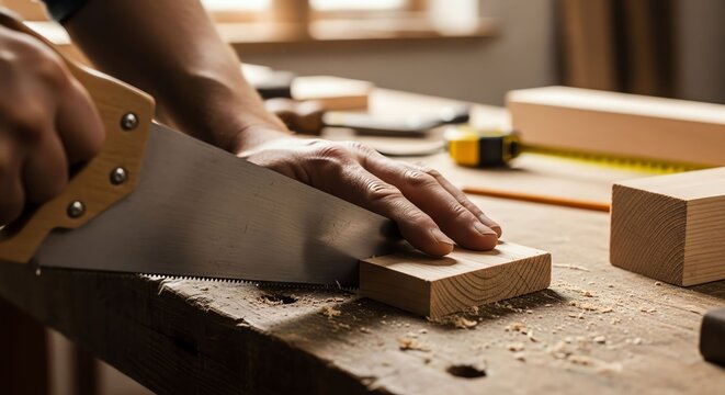 Man Cutting Wooden Block in Workshop with Hand Saw and Carpentry Tools