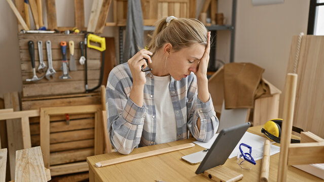 A concerned young woman in a woodworking studio with a smartphone, tools, and lumber.
