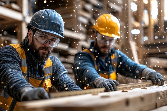 Workers Engaged in Carpentry With Safety Gear in a Bustling Workshop During Daylight, Showcasing Teamwork and Craftsmanship With Wood Materials