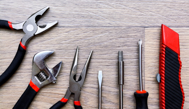 A set with tool on a wooden table. Hammer, screwdriver, gayachnye wrenches, pliers, wire cutters. Top view.
