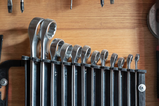 Set of used metal steel ring wrench organized and hanged in plastic holder against wooden wall. Workshop spanner tools and equipment industrial background. Garage workshop toolkit