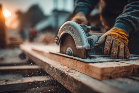 A skilled carpenter uses a circular saw to precisely cut lumber, creating a clean and accurate cut with wood dust flying in a wood workshop or a construction site.
