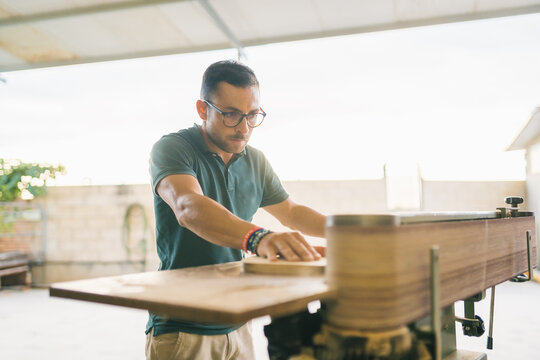 Unrecognizable carpenter working on a wooden piece using professional grinding machine. Wood goods creation process. High quality photo
