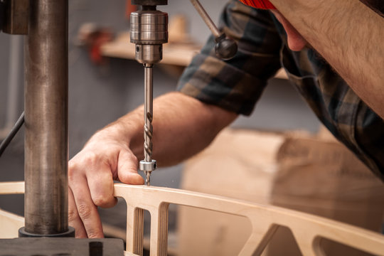 Handyman side view Close up of man drilling wood with a drill machine in a workshop, Close-up of carpenter using electric drill in workshop.Joinery work on the production of wooden furniture.
