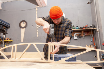 Home repair concepts, close up. Handicraft Carpentry. Cabinet-maker hands drilling a wooden plank using screwdriver on the working table in the workshop