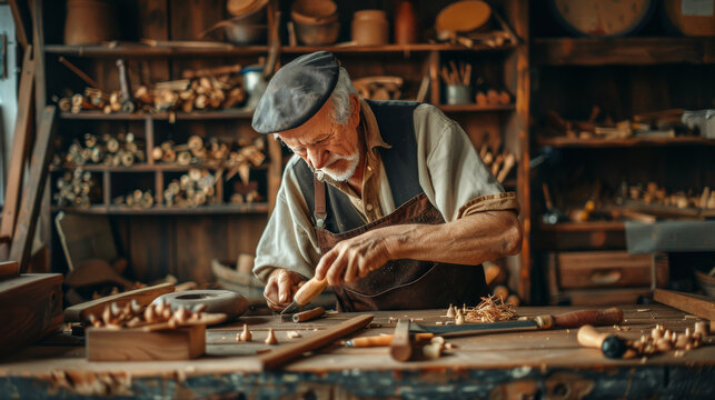 A skilled artisan working at a well-organized wooden workbench, using traditional tools like chisels, saws, and carving knives. Emphasize the focus and precision in their movements.