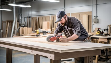 Carpenter using a table saw to cut wood pieces in a workshop. Featuring power and precision