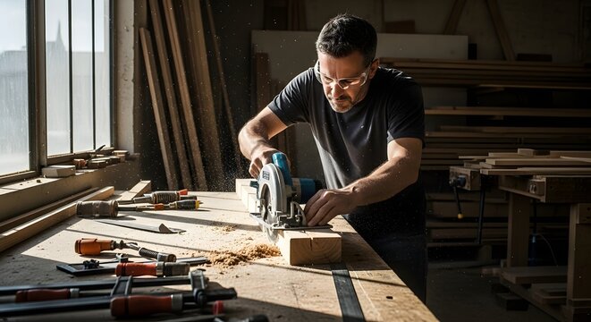 Man using a circular saw to cut wood in a workshop with safety glasses and sawdust flying around him