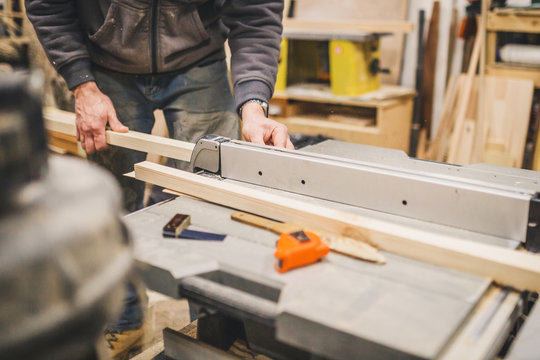 Carpentry workshop - the master saws the wooden bar - safety precautions when working on a circular saw