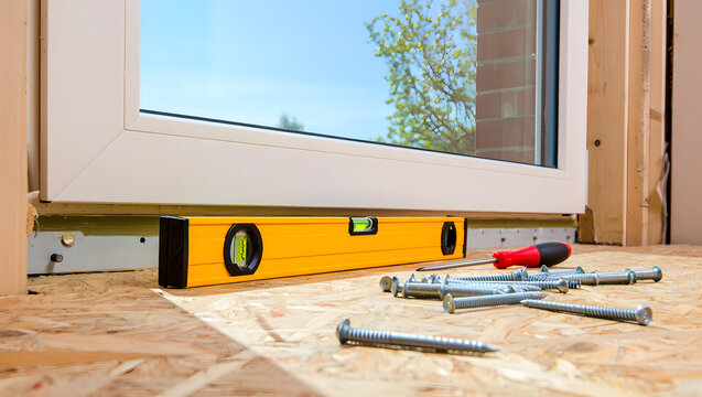 A person is using a yellow level tool to ensure a wooden plank is straight and properly aligned.