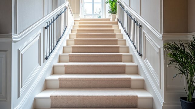 Elegant wooden staircase featuring plush carpet runner with subtle grey pattern. Interior design element combines classic style with modern comfort, safety. Rich wood finish, soft carpeting create