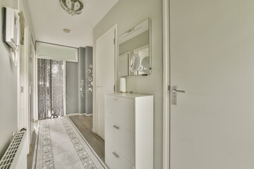 minimalist staircase featuring gray carpet runner and white walls in modern house