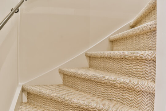 Panorama Indoor stairs of home with metal handrail and gray carpet on the treads