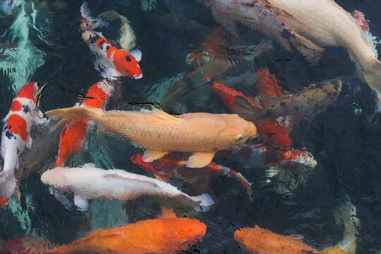 many beautiful colorful ornamental fish in the pond