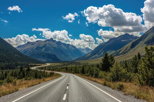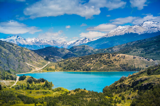 Curved asphalt road in the mountains. Adventure road Carretera Austral lies in the valley near the town of Cerro Castillo, Patagonia, Chile