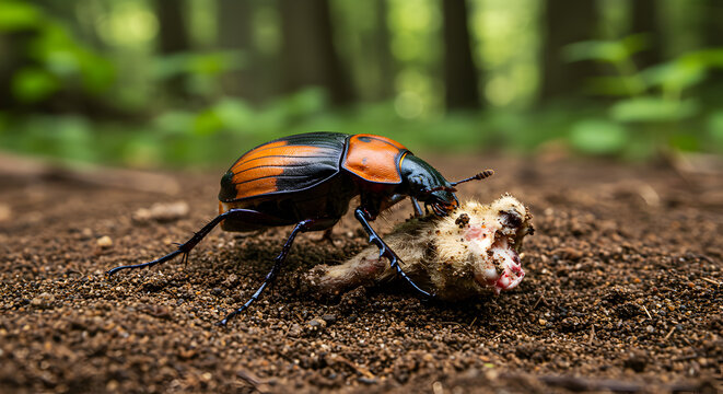 a carrion beetle - Oiceoptoma thoracica sits on a yellow flower in early spring in the forest