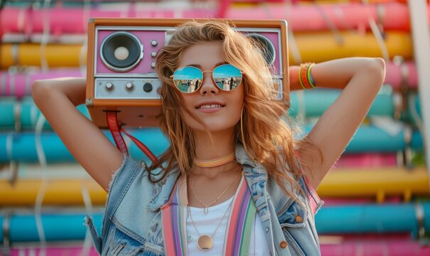 Young woman carrying boom box on shoulder dancing in front of colorful pipes