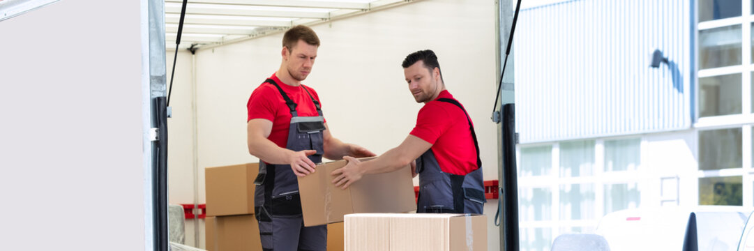 Young Men Stacking The Cardboard Boxes In Moving Truck