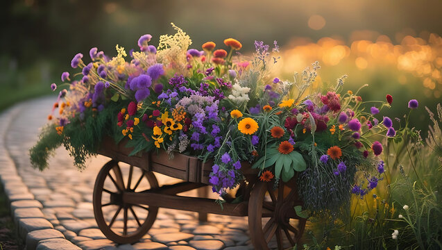 A small wooden cart overflowing with a colorful bouquet of wildflowers sits on a stone path in a sunlit field.