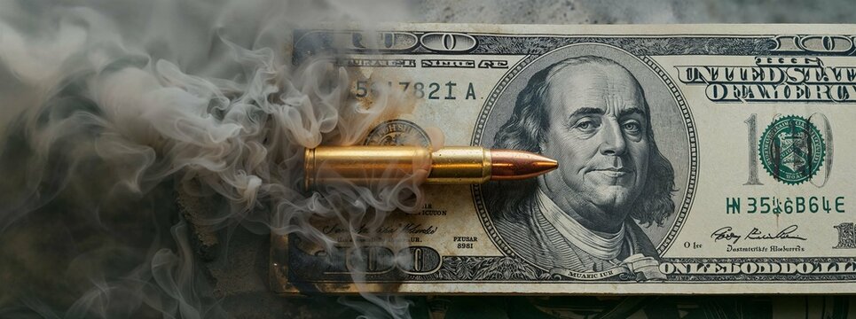 risky investments and risk in financial market, dollar inflation or the sale of weapons , also bankruptcy danger in business, banner of bullet shooting dollar with fire smoke