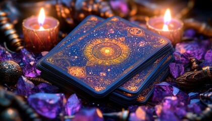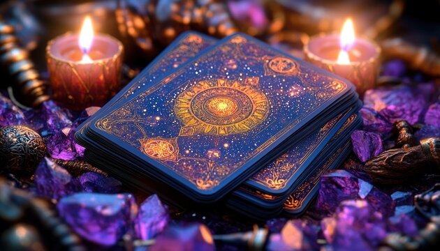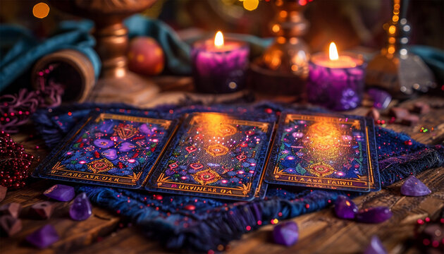 Tarot Cards and Candlelight with Purple Crystals for Fortune Telling and Astrology in a Mystical Scene