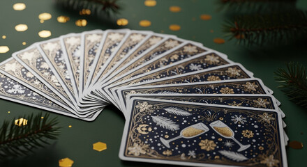 deck of artistic prediction cards fanned out on dark green surface. Gold confetti pieces and small evergreen sprigs rest on the cards. New Year cartomancy playing card spread, festive gold design