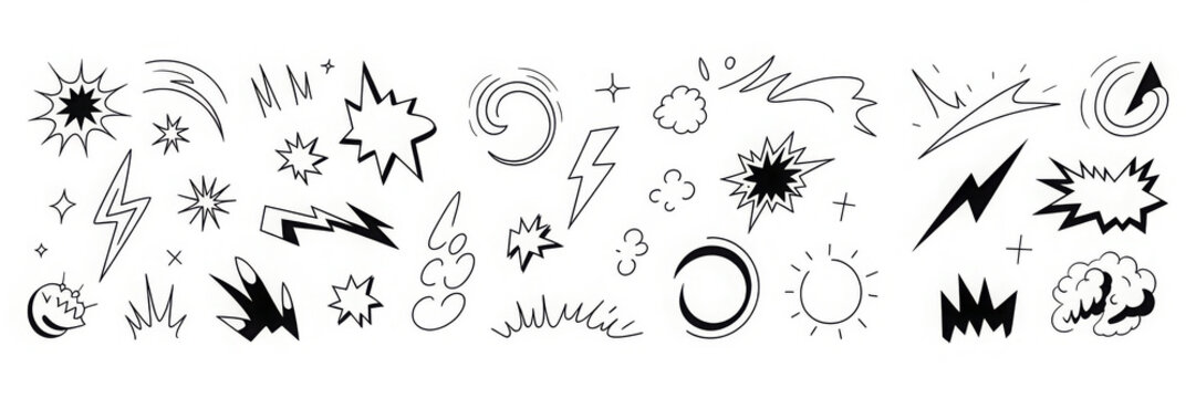 Comic line speed effect cartoon explosive vector set. Hand drawn sketch doodle comic line speed motion, explosive cartoon burst, boom energy, impact power action element. Vector illustration
