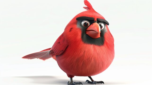 Angry cartoon cardinal studio shot, autumn leaves, blue background, mascot