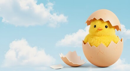 Cracked cartoon egg with a baby chick popping out, positioned on the right third, with soft clouds and blue sky filling the rest
