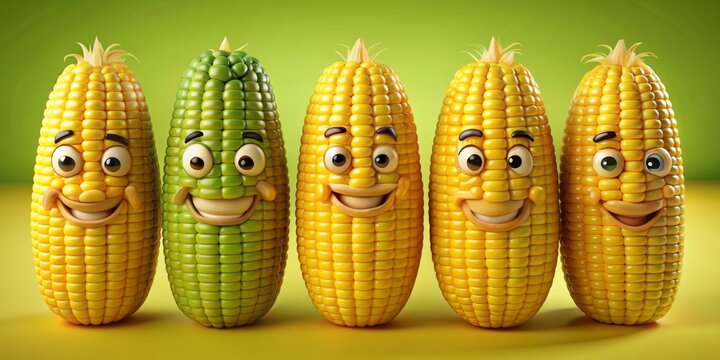 Smiling Corn Cob Cartoon Characters, 3D render, 5 corn cobs, green and yellow background, corn on the cob, vegetable characters, cartoon corn