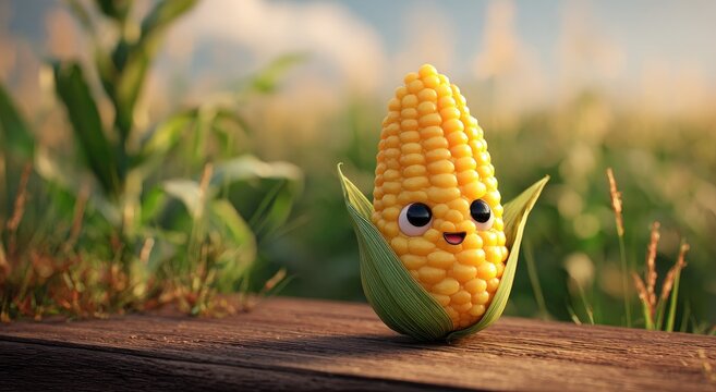 a 2D cartoon illustration of a happy corn on the cob, summer vibes, white background--ar 16:9