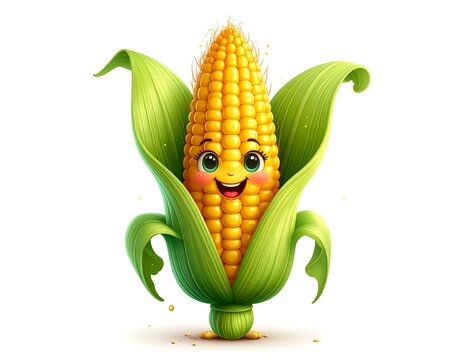 A cute cartoon corn on the cob character with a happy, joyful expression, waving its arms on a white background.