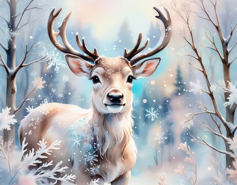 Deer in winter wonderland with falling snow