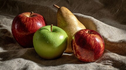 Fresh-picked apples and pears on a canvas cloth with strong shadows