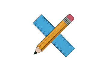 A simple drawing showing a yellow pencil over a blue ruler creating a cross on a transparent background for design use.