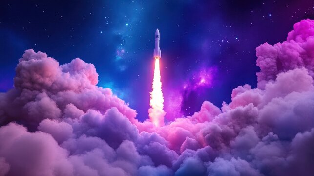 Colorful space rocket blasting off into stars, thick swirling clouds below catching the vibrant light of the launch.