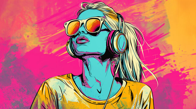 Comic book woman in pop art style expressing surprise against a sky with clouds and stars