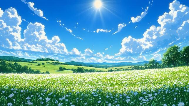 An anime-style cartoon depicting a green summer meadow under a blue sky with clouds.