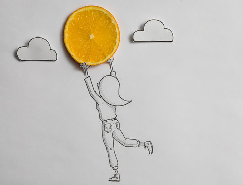 Cheerful cartoon cartoon chicken balancing on vibrant orange background