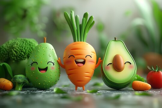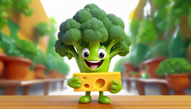 3d cartoon artwork of a smiling broccoli character holding a piece of cheese